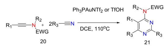 - Karad, S.N.; Liu, R. Regiocontrolled Gold-Catalyzed [2 + 2 + 2] Cycloadditions of Ynamides with Two Discrete Nitriles to Construct 4-Aminopyrimidine Cores. Angew. Chem. Int. Ed. 2014, 53, 9072–9076. [Google Scholar] [CrossRef]
