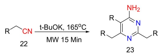 Williams et al. discovered a four-step synthesis scheme for making 4-aminopyrimidine units using ethyl 3-ethoxypropionate as the starting material (Scheme 7). However, corrosive and toxic reagents like ammonium gas and phosphoryl chloride were utilized to get satisfactory yields [49]. Karad et al. developed a metal-catalyzed or strong acid-mediated intermolecular cycloaddition of ynamides with nitriles for the synthesis of 4-aminopyrimidines using Scheme 8 [50]. Baxendale et al. described the microwave synthesis of 4-aminopyrimidines using single nitriles in the presence of a catalyst such as potassium tert-butoxide (Scheme 9). The reaction of acetonitrile in 3 mol of potassium tert-butoxide gave 2,6-dimethylpyrimidin-4-ylamine with a yield of 48% after 20 min at 140 °C. The synthesis of the final product was confirmed using liquid chromatography-mass spectroscopy (LC-MS) and the results indicated 90% conversion [51]. Zhu et al. described a catalyst-free and facile synthetic scheme for the creation of 4-aminopyrimidine scaffold. The β-enaminonitriles can be converted to 4-aminopyrimidines through modifiable reaction conditions (Scheme 10). β-Enaminonitriles play a critical role in the preparation of heterocyclic compounds that are extensively synthesized in dyes, pesticides, medicines, and fungicides. Hence, economical and practical synthetic routes of 4-aminopyrimidines and β-enaminonitrile has immense utility in organic chemistry and pharmaceutical chemistry. The application of organonitriles as a supplemental source of nitrogen is an area of great scientific interest currently in the synthesis of 4-aminopyrimidine moieties [52].