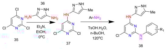 Long et al. developed a synthetic scheme for synthesizing 2,4-diaminopyrimidines using Scheme 13. The coupling of 3-amino-5-methyl pyrazole with 2,4,6-trichloropyrimidine formed a C-4 substituted pyrimidine. The intermediate was formed using nucleophilic substitution of various anilines at the C-2 position of the pyrimidine core, and yields of the products ranged from 10–50% [55].