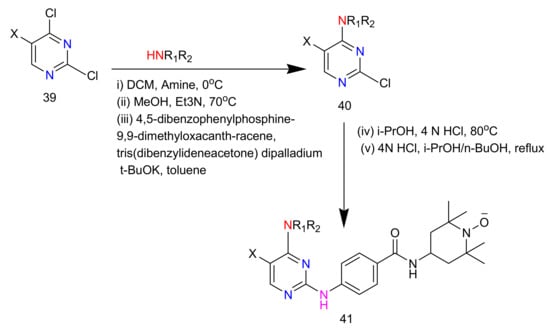 Ma et al. synthesized analogues of nitroxide-labelled pyrimidines (Table 3) using the reactions shown in Scheme 14. Of these, 41l was effective on many cancer cell lines in the anti-proliferative study with IC50 values of 0.89, 2.27, 11.41, and 5.73 on A-549, HeLa, LoVo, and HepG2, respectively. Almost all the analogues were perceived to be more potent than the VX-680 standard with 41l being the most effective. 41l exhibited AURKA and AURKB inhibition in a kinase-Glo-luminescent assay with IC50 values of 0.0093 and 0.0028 µM, respectively. 41l was tested for immunofluorescence effects at two concentrations i.e., 2.5 and 5.0 µM in HeLa cell line on AURKA with Thr288 and AURKB with Thr232. These studies established that 41l repressed AURKA autophosphorylation in a dose-dependent manner with slightly more selectivity towards AURKB. 41l displayed AURKB inhibition at 2.5 µM and AURKA inhibition at 5.0 µM [56].