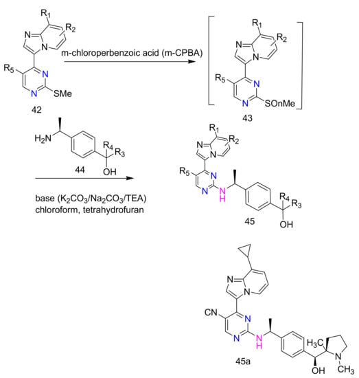 Takashi et al. synthesized compound 45 and its analogues as potential PLK inhibitor and patented this work (WO-2008081910-A1). Scheme 15 depicts the synthesis of compound 45 consisting a 2-aminopyrimidine moiety wherein R1 and R2, which may be the same or different, are each a hydrogen atom, a halogen atom, a lower alkyl group which may be substituted, or a cyclopropyl group; one of R3 and R4 is a hydrogen atom, while the other one of R3 and R4 is a lower alkyl group substituted with NR3Rb, where R3 and Rb may be the same or different, are each a hydrogen atom, a lower alkyl group, a benzyl group, or a cycloalkyl group having three to six carbon atoms with one or more same or different substituents and R5 is a hydrogen atom, a cyano group, a halogen atom, or a lower alkyl group. Measurement of the inhibitory effect of the synthesized compounds was performed against PLK 1 activity and PLK 1 at cellular level using human uterine cervix cancer cell lines HeLaS3 cells. Of the 38 analogues synthesized compound 45a showed better PLK-1 inhibitory activity with an IC50 of 1.8 nM and EC50 of 2.9 nM in a HeLaS3 cell line proliferation assay [57].