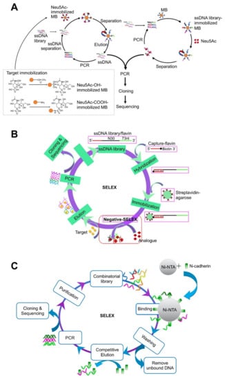 - Bayat, P.; Nosrati, R.; Alibolandi, M.; Rafatpanah, H.; Abnous, K.; Khedri, M.; Ramezani, M. SELEX methods on the road to protein targeting with nucleic acid aptamers. Biochimie 2018, 154, 132–155. [Google Scholar] [CrossRef]