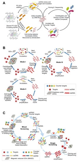 | Carbon-based nanomaterial platform | Graphene oxide (GOx) | Enables a free interaction of target and oligo Simple removal of unbound oligos using selective adsorption of ssDNA by GOx Enables fabrication of GOx with additional functionality (e.g., magnetic reduced GOx) Enables optimization of SELEX conditions using the fluorescent quenching property of GOx | Potential failure of separation by low water solubility |