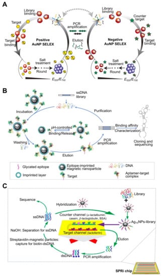 | Silver nanoparticle | Enables a development of SELEX strategy combined with other plasmonic sensing strategy (e.g., SPRi) | Required a conjugation process for target |