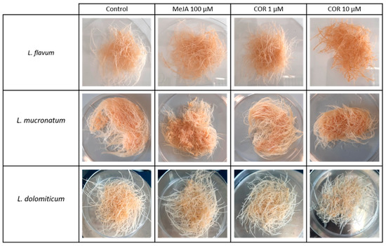 This growing time was adopted since the three Linum ARc needed almost 8–10 days of adaptation to the liquid medium before entering exponential growth. Then, on day 21 MeJA and COR treatments were applied to the cultures for four days. The use of MeJA and COR on the ARc of the species considered in this work is reported for the first time, even though their use was already reported for cell suspensions and ARc of other Linum species. As shown in Figure 1 and Figure 2, the elicitor treatments caused an inhibition of growth as already reported for other species [25]. A two-way analysis of variance (ANOVA, Table S1) highlighted a reduction on the final growth of L. flavum and L. mucronatum ARc after the addition of MeJA or COR (Figure 2). On the contrary, in L. dolomiticum ARc, MeJA and COR did not significantly inhibit growth (Figure 2).