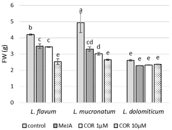 Effect of elicitors on the growth of ARc of L. flavum, L. mucronatum and L. dolomiticum over a cultivation period of 25 days in MS-II liquid medium expressed as fresh weight (FW) in grams; control (light gray), MeJA (100 µM, dark gray), COR 1 µM (white), COR 10 µM (dotted). Each value is the mean of three biological replicates ± SD. The samples with different letters are significantly different at p ≤ 0.05 according to Duncan test. The growth index of each ARc culture is reported from left to right; L. flavum: 4.2, 3.4, 3.3, 2.2; L. mucronatum: 5.2, 3.1, 2.8, 2.3; L. dolomiticum: 2.3, 1.9, 1.9, 2.0.
