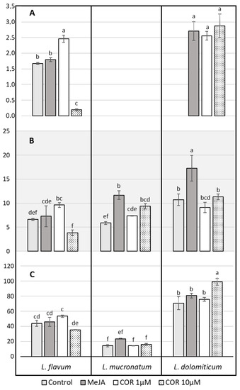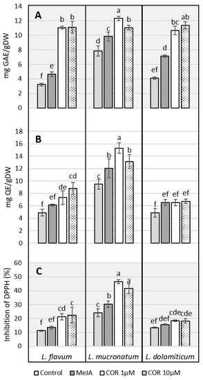 Effect of elicitors on L. flavum, L. mucronatum and L. dolomiticum ARc; control (light gray), MeJA (100 µM, dark gray), COR 1 µM (white), COR 10 µM (dotted). (A) Phenol content expressed as gallic acid equivalent, mg GAE/g DW. (B) Flavonoid content expressed as quercetin equivalent, mg QE/g DW. (C) Antioxidant capacity expressed as percent of inhibition of DPPH. Each value is the mean of three biological replicates ± SD. The samples with different letters are significantly different at p ≤ 0.05 according to Duncan test.