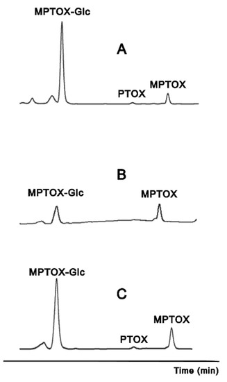 An aliquot of 85 µg of purified MPTOX–Glc was digested with 20 U of β-glucosidase from almonds. The reaction was carried out in a phosphate buffer pH 5.0 at 25 °C for 24 h. The digested extracts were analyzed by HPLC at 2, 4, 6 and 24 h.
