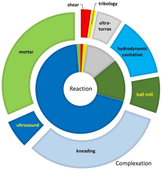 - Cintas, P.; Cravotto, G.; Barge, A.; Martina, K. Interplay Between Mechanochemistry and Sonochemistry. In Polymer Mechanochemistry Topics in Current Chemistry; Springer International Publishing: Cham, Switzerland, 2014; pp. 239–284. [Google Scholar] [CrossRef]