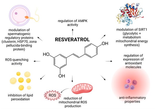 RES has been proven as an exceptional in vitro antioxidant that may be attributed to four main mechanisms of action: (a) a direct prevention of ROS overproduction in the sperm mitochondria, (b) the ability to scavenge superoxide, hydroxyl radical, and metal-induced radicals, (c) inhibition of oxidative insults to the sperm lipids, and (d) regulation of the activity of endogenous antioxidants [34,35,37,52].