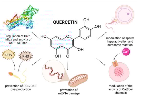 Adverse effects of QUE on the sperm motion behavior may be directly associated with the previously discussed ability of the biomolecule to modulate Ca2+-ATPase activity [100]. Inappropriately high doses of QUE may decrease the activity of the enzyme, which will subsequently lead to an accumulation of Ca2+ in the cell. Supraphysiological Ca2+ levels will then block the motion apparatus of the sperm cell, lowering the cAMP concentration and restricting the ATP supply with a concomitant fall in its motility [87,100]. High intracellular Ca2+ concentrations may also decrease the level of tyrosine phosphorylation events that are absolutely required for the maintenance of acrosome reaction and capacitation [100]. In addition, QUE exhibited significant inhibitory effects on the hyaluronidase activity and sperm penetration ability in non-capacitated, capacitated and acrosome-reacted cynomolgus monkey sperm in a dose-dependent manner [101].