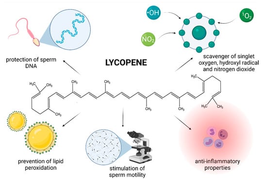 Numerous reports have shown that this red pigment exhibits protective effects against malignant, cardiovascular, neurodegenerative and eye diseases [102]. It has been reported that LYC accumulates in lipid-rich seminal prostasomes, providing them protection against degradation [104], which is why the molecule is particularly effective in the prevention of prostate cancer [105]. Furthermore, it has been revealed that LYC concentrations in the testes are higher in comparison to other organs indicating that the molecule is likely to play an important physiological role in the process of spermatogenesis [25]. This hypothesis was further fortified by Palan et al. [106] who reported that the concentration of LYC was significantly lower in the seminal plasma collected from infertile men. Additional research [107,108,109] has revealed that the amount of LYC in the seminal plasma increases with oral supplementation of the compound. Summarizing the above-mentioned information, it may be strongly assumed that the intake of LYC will offer a higher level of protection against testicular oxidative stress, and hence possible male reproductive dysfunction.