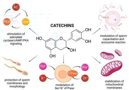 In vitro animal studies revealed that catechin concentrations oscillating between 25–100 μmol/L led to a higher motility and membrane integrity preservation of extended and/or cryopreserved bull [147,148], canine [149], caprine [150,151] and boar spermatozoa [152]. This may be explained by a high ability of catechins to be incorporated into the plasma membrane, and thus avoid possible fluctuations in ion concentrations and alterations of the Na+/K+ ATPase, which may have lethal consequences to the sperm survival [153]. Consequently, the stabilization of membrane fluidity resulted in a sperm cell that was better equipped to withstand a variety of physical and environmental assaults [150].
