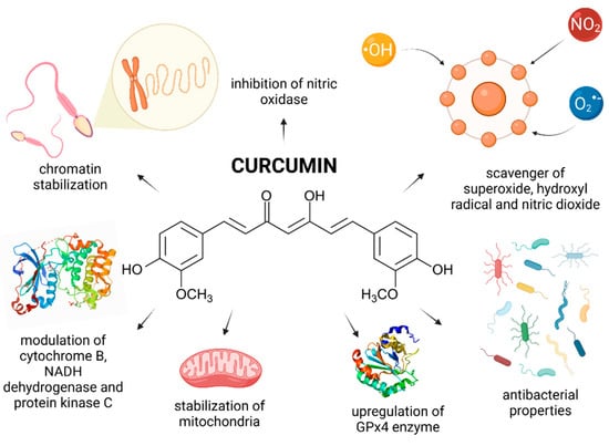 Furthermore, it has been reported on numerous occasions that CUR presents with the ability to reverse reproductive toxicity caused by a variety of endogenous or exogenous triggers. According to Izadpanah et al. [168] 100 mg/kg CUR had ameliorative effects on varicocelized rats, as confirmed by a significant restoration of the sperm count, motility, and morphology. Higher testicular biopsy score values, increased seminiferous tubules diameter and testicular weight alongside improved sperm parameters such as count, motility and morphology were furthermore observed following CUR supplementation to experimental animals exposed to di(2-ethylhexyl)phthalate [169], metronidazole [170], chromium [171], lindane [172], cyclophosphamide [173], morphine [174], fluorescent radiation [175] or protein deficiency, indicating a versatility of the biomolecule that may be applied under different circumstances.