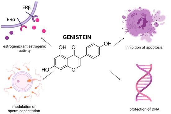 - Ganai, A.A.; Farooqi, H. Bioactivity of genistein: A review of in vitro and in vivo studies. Biomed. Pharmacother. 2015, 76, 30–38. [Google Scholar] [CrossRef]