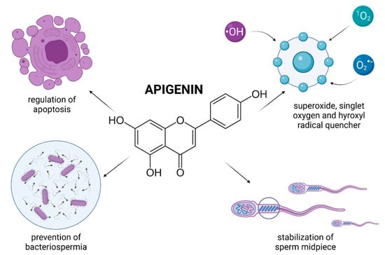 - Dang, Y.; Li, Z.; Luo, B.; Pan, L.; Wei, Q.; Zhang, Y. Protective effects of apigenin against acrylonitrile-induced subchronic sperm injury in rats. Food Chem. Toxicol. 2017, 109, 517–525. [Google Scholar] [CrossRef] [PubMed]