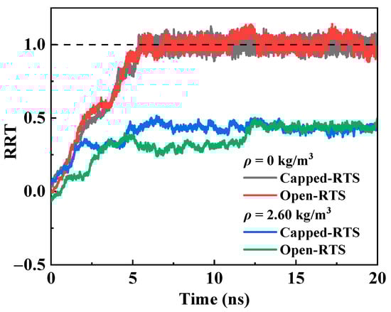 Figure 1 shows the curves of RRT for two RTS models with different rotor end structures in vacuum and helium environments. In this section, the size of the simulation box is set to 8 nm × 8 nm × 8 nm, ρ is 2.60 kg/m3, the input ωm is 200 GHz, and the system temperature is 300 K. It is found that when the RTS works in a vacuum environment, the RRT curves of the open-rotor RTS and the capped-rotor RTS almost coincide, and both can reach 1.0 within 5.5 ns. Therefore, the end structure of the rotor does not affect the transmission behavior of the RTS in the vacuum environment. However, when the RTS works in a helium environment with ρ = 2.60 kg/m3, the highest RRT of the open-rotor RTS and the capped-rotor RTS can only reach about 0.49, because of the increase in total frictional resistance caused by the action of helium atoms. Compared with the open-rotor RTS, the response time for the RRT of the capped-rotor RTS reaching 0.49 is shorter.