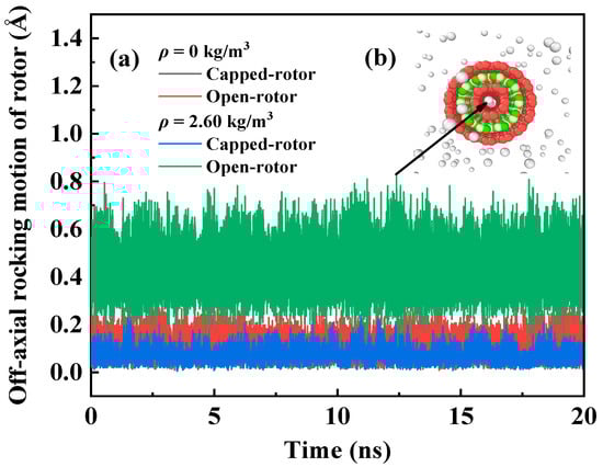 Regardless of whether the RTS works in a vacuum or helium environment, the motor and rotor will swing eccentrically during the movement, and the center of mass will deviate from the center line to a certain extent. This is one of the important factors that affect the stability of the RTS structure. The larger the off-axial rocking distance, the worse the stability of the RTS. Figure 2 depicts the time histories of the off-axial rocking motion of the rotor with different end structures in the vacuum and helium environment. It can be seen from Figure 2 that the degree of the off-axial rocking motion of rotor in a helium environment is greater than that in a vacuum environment due to the effect of helium atoms. The off-axial rocking distances of the open-rotor in the RTS working in vacuum and helium environment are about 0–0.38 Å and 0.2–0.8 Å, respectively, and those of the capped-rotor are about 0–0.2 Å and 0–0.25 Å, respectively. The off-axial rocking distances of the open-rotor are larger than those of the capped-rotor because helium atoms will run into the inner open-tube rotor when the RTS is surrounded by helium atoms, as shown in the inset of Figure 2b. The helium atoms in the open-rotor and the carbon atoms on the rotor are not in the equilibrium distance, which causes the helium atoms to attract or repel the inner tube, leading a larger off-axial rocking motion of rotor. However, the off-axis swing of the capped-rotor in the helium environment is almost negligible compared to that in the vacuum environment. Therefore, the capped-rotor RTS is more stable than the open-rotor RTS when they work in a helium environment. So capped-rotor RTSs will be adopted in the subsequent MD simulations.