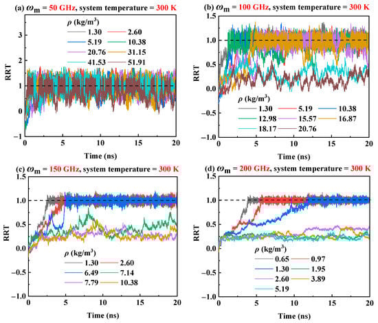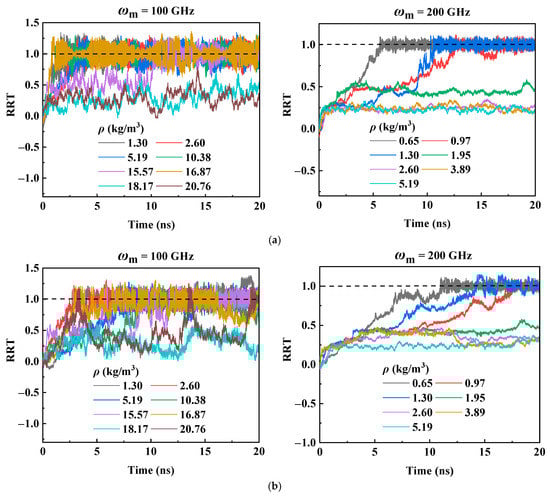 In order to reflect more accurately the influence of ρ on the transmission performance of RTS, two sizes of the simulation box, i.e., 16 nm × 16 nm × 8 nm and 32 nm × 32 nm × 8 nm, are added for investigating the transmission performance of RTS in this section, in which the system temperature is 300 K and ωm is set to 100 GHz and 200 GHz, respectively. For the same ρ, a larger simulation box has more helium atoms, as listed in Table 1 in Section 3.1. Figure 5 depicts the time histories of the RRT curves for RTS under the cases of different simulation box sizes. From Figure 5a,b, it can be found that when the size of the simulation box size is 16 nm × 16 nm × 8 nm or 32 nm × 32nm × 8 nm, the critical working ρ range of RTS at the corresponding ωm of 100 GHz and 200 GHz are both 15.57–16.87 kg/m3 and 0.97–1.30 kg/m3, respectively, which are consistent with those obtained from the simulation box size of 8 nm × 8 nm × 8 nm (Figure 3b,d). Therefore, the simulation results are independent on the size of the simulation box.
