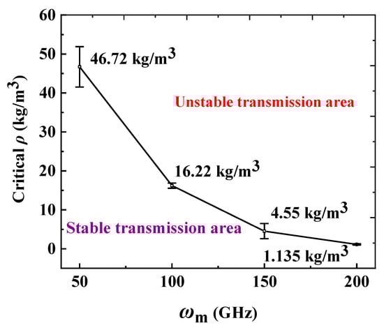 According to the critical density range in Figure 3, Figure 4 gives the critical helium density error bar as a function of the input rotational frequencies of the motor. We respectively define the area under the curve and the area above the curve as stable and unstable areas. It can be seen from Figure 4 that as ωm increases, the critical density range decreases, which suggests that the RTS can work stably in a helium environment with a high ρ when it works at a low motor rotation frequency, and can only work in a helium environment with a low ρ when the RTS works at a high motor rotation frequency.