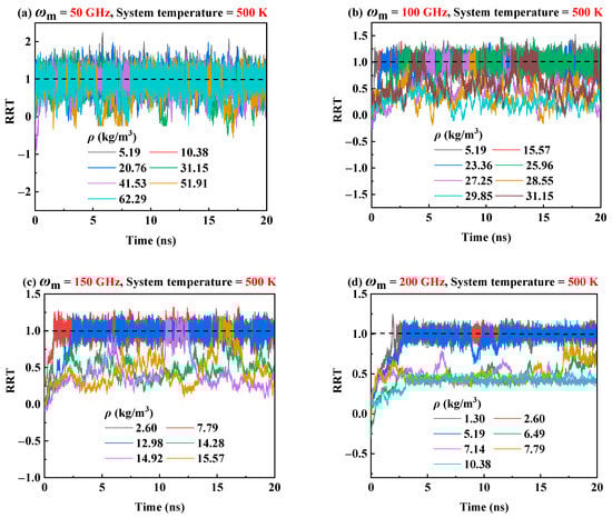The transmission behavior of the RTS at the 300 K has been analyzed in Section 2.2. It is well known that temperature is one of the major factors that affect the transmission performance of the RTS [43,53,54]. Hence, in order to investigate the influence of system temperatures on the transmission performance of RTS in helium environment, three temperatures of 150 K, 300 K, and 500 K are considered. Figure 3 shows that when the system temperature is 300 K in case of ωm = 50 GHz, 100 GHz, 150 GHz and 200 GHz, the corresponding critical working density range is 41.53–51.91 kg/m3, 15.57–16.87 kg/m3, 2.60–6.50 kg/m3, and 0.97–1.30 kg/m3, respectively. However, when the system temperature drops to 150 K, the critical working density range of the RTS will be reduced, as shown in Figure 6. It can be seen from Figure 6 that when ωm is 50 GHz and 100 GHz, the RRT could reach 1.0 when ρ range is lower than 27.25–28.55 kg/m3 and 3.89–5.19 kg/m3 respectively. However, when ωm is 150 GHz and 200 GHz, the transmission performance of RTS in the helium environment under the density range we studied is very poor. At higher temperatures, the thermal vibration of atoms/molecules in the system becomes more severe, and the nonbonding interaction at the adjacent ends of the rotor and the motor becomes more energetic. Therefore, when the system temperature rises within a certain range, the interlayer van der Waals effects and the end effects of RTS increase, so the driving force of the rotor increases with the increase of temperature [43]. The rotor rotational speed will accelerate as the environmental temperature rises [53,54]. When the system temperature rises to 500 K, although the skin friction drag of helium increases with the increase in temperature, a higher critical working density range of RTS is allowed because of the greater driving force with the increasing temperature. Figure 7 shows that when the system temperature is 500 K and ωm is 50 GHz, 100 GHz, 150 GHz, and 200 GHz, the critical working gas density range is 51.91–62.29 kg/m3, 23.36–25.96 kg/m3, 7.79–12.98 kg/m3 and 2.6–5.19 kg/m3, respectively. Hence, the system temperature will seriously affect the critical working gas density range of the RTS.