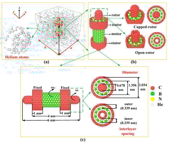 In order to investigate the dynamic behavior of the RTS in a helium environment, a RTS made from CNT (5, 5)/BNNT (10, 10)/CNT (15, 15) in a helium-filled simulation box is set up, as shown in Figure 9. Figure 9a shows a heterogeneous TWNTs RTS made of CNTs and BNNT placed in the center of a simulation box with a boundary length of a × b × c in a helium environment. Figure 9b depicts two RTS models with different end structures of the rotor, one being the capped-rotor RTS model, and the other being the open-rotor RTS model. Figure 9c shows the construction parameters of the RTS model, where the inner CNT (5, 5) with a length of 6 nm and a diameter of 0.678 nm acts as rotor, the middle BNNT (10, 10) with a length 4 nm and a diameter of 1.356 nm acts as motor, and the two outer separated CNTs (15, 15) with a length of 1 nm and a diameter of 2.034 nm are fixed as stators. The inner and outer interlayer spacing are both set to 0.339 nm. The nanotubes of TWNTs in this model have a symmetrical layout along the z axis. The CNT stators are fixed during the MD simulations. ωm and ωr represent the rotation frequencies of motor and rotor, respectively. Table 1 lists the number of helium atoms corresponding to different helium densities ρ in the simulation box with different sizes.