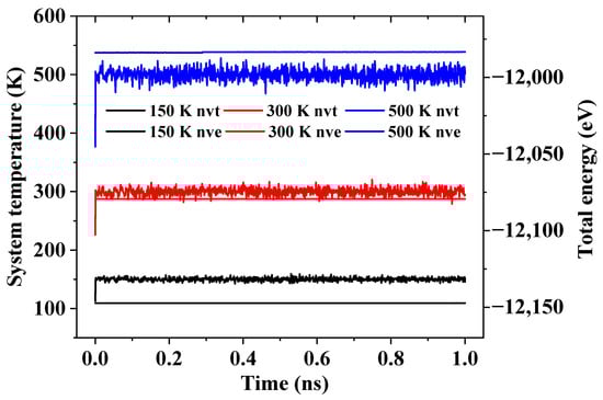 Initially, the helium atoms in the RTS model are laid out regularly in lines in the simulation box, and the boundaries for the global simulation box in each dimension are periodic. Consequently, at the beginning of the simulation, the structure is reshaped under minimized potential energy of the system by relaxing the system at the canonical NVT ensemble for 1 ns and the microcanonical NVE ensemble for 1 ns to obtain a reasonable layout of helium atoms with the RTS model, where N is the total number of particles in the system, V is the system’s volume, T is the absolute temperature, and E is the total energy in the system. As shown in Figure 10, it can be clearly seen that under a different system temperature, the total energy of the system is well converged during the relaxation. After the relaxation, the stators are fully fixed, and then the motor is applied with a continuous rotation at a given frequency through the command “fix move rotate”. This command essentially sets the angular velocity of each atom on the motor around the axis of rotation. The atoms on the rotor are free. The movement of rotor driven by the motor under the microcanonical NVT ensemble is recorded. For the systems of different system temperatures and different ωm, the time to reach equilibrium rotation frequency of the rotor is also different, and the specific range is also clarified by Zheng et al. [43]. In addition, when the speed of the motor increases, the time to reach equilibrium rotation frequency of the rotor also increases, so the total time for the simulation is 20 ns. The time step for all simulations is chosen to be 1 fs. LAMMPS [60] (Large-scale Atomic/Molecular Massively Parallel Simulator) is employed in the simulations.