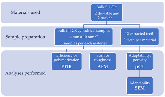 This study was carried out in order to analyze four commercial bulk fill CRs (viz., Filtek™ Bulk Fill (3M™ ESPE, St. Paul, MN, USA), Tetric EvoCeram® Bulk Fill (Ivoclar Vivadent AG, Schaan, Liechtenstein), SureFil® SDR™ flow (Dentsply Sirona, Charlotte, NC, USA) and Tetric EvoFlow® Bulk Fill (Ivoclar Vivadent AG, Schaan, Liechtenstein)). It consisted of two parts: first, the analysis of the efficiency of the polymerization by FTIR and the surface roughness by AFM on the cylindrical samples, and second, an analysis of the adaptation and porosity by µCT and SEM on the restorations performed on extracted human teeth (Figure 1).