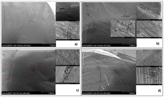SEM microphotographs of the longitudinal sections of the restored teeth (white arrows are areas of good adaptation, yellow arrows are areas of moderate adaptation, red arrows are areas of inadequate adaptation and red circles are the presence of voids within the material): (a) Adper Easy Bond™+Filtek™ Bulk Fill (3M™ ESPE, St. Paul, MN, USA), (b) AdheSE®+Tetric EvoCeram® Bulk Fill (Ivoclar Vivadent AG, Schaan, Liechtenstein), (c) Prime&Bond NT®+SureFil® SDR® flow+TPH Spectra ST® (Dentsply Sirona, Charlotte, NC, USA) and (d) AdheSE®+Tetric EvoFlow® Bulk Fill+Tetric EvoCeram® Bulk Fill (Ivoclar Vivadent AG, Schaan, Liechtenstein).