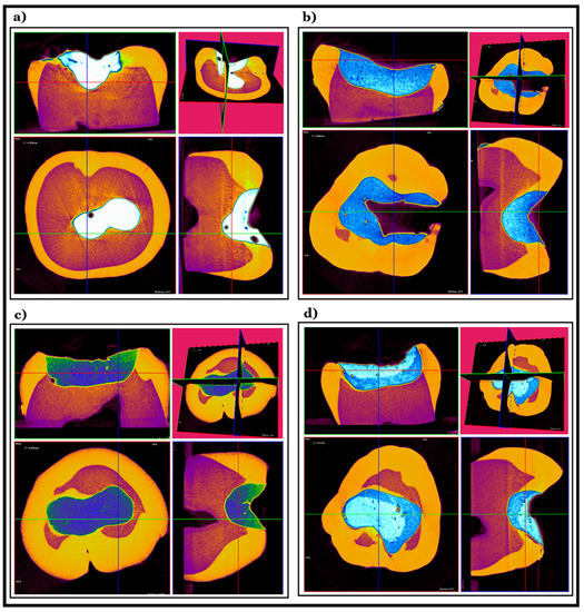 µCT photographs of the restored teeth: (a) Adper Easy Bond™+Filtek™ Bulk Fill (3M™ ESPE, St. Paul, MN, USA)—the presence of large air voids within the material, (b) AdheSE®+Tetric EvoCeram® Bulk Fill (Ivoclar Vivadent AG, Schaan, Liechtenstein)—the presence of small air voids dispersed within the entire restorative material, (c) Prime&Bond NT®+SureFil® SDR® flow+TPH Spectra ST® (Dentsply Sirona, Charlotte, NC, USA)—a defect in the adaptation towards the cavity wall at the bottom of the cavity, with air voids pronounced at the interface between the flowable and sculptable CR layer and (d) AdheSE®+Tetric EvoFlow® Bulk Fill+Tetric EvoCeram® Bulk Fill (Ivoclar Vivadent AG, Schaan, Liechtenstein)—an excellent adaptation of the flowable CR towards the cavity walls, with the presence of a large quantity of air voids within the sculptable CR, especially in between layers.