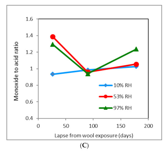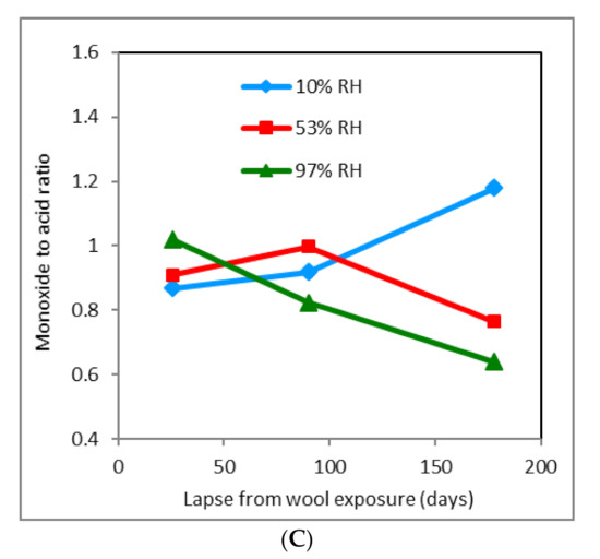 It would be expected that the highest initial acid and monoxide contents in the 97% RH sample (Figure 4B) is accompanied by the highest sorptivity. Indeed, this increased linearly, but in a substantially lower range of the sorptivity. The representation of the acid and monoxide with time only decreased, whereby the acid was always predominant at the expense of the monoxide. This also corresponds with the curve in Figure 4C.