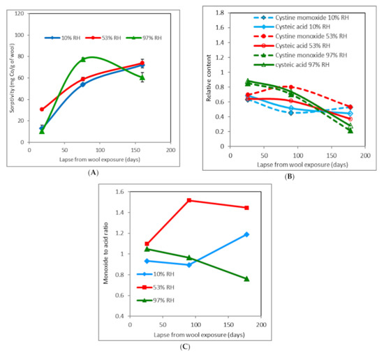The time development of cysteic acid and cystine monoxide contents (Figure 2B) for the 10% RH sample “copies” the sorptivity with the intent that after 90 days both parameters would achieve a maximum. However, unlike sorptivity (Figure 2A), the acid and cystine monoxide contents are comparable for the first and the last measurements. As regards the dependence of the ratio of the monoxide to acid content (Figure 2C) reflecting transformation of the oxide into the acid, this is flat and corresponds to almost parallel developments of both components (Figure 2B).