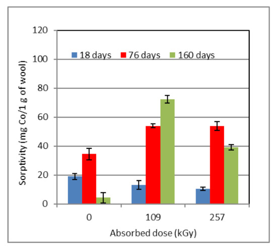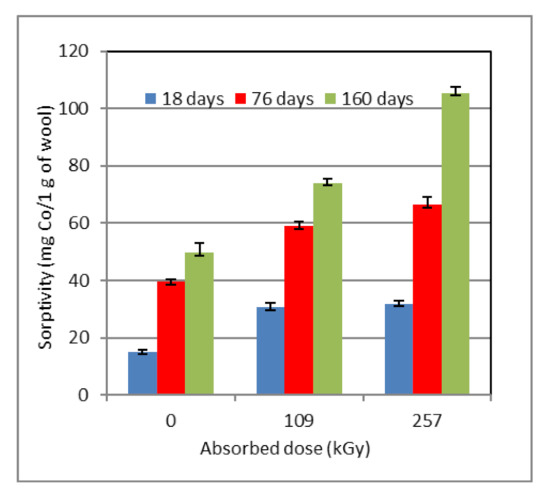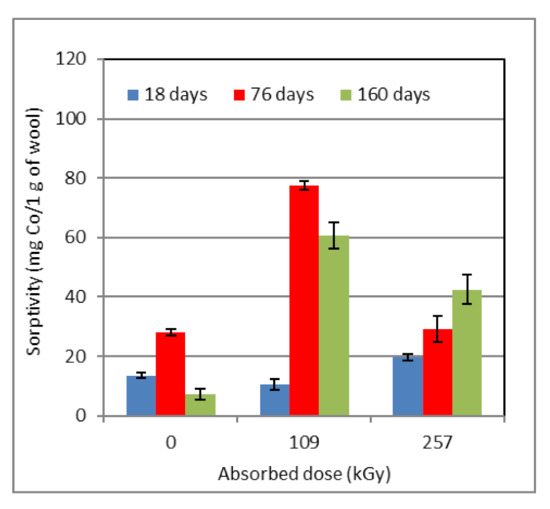 In the non-irradiated wool (0 kGy), just removing the initial humidity and subsequent wetting to an equilibrium could bring changes in the sorptivity and chemical structure. As mentioned above [29], even in non-irradiated wool without pre-conditioning, irregular conformational changes in the secondary structure take place, which may affect the sorptivity development. As shown in Figure 5, the sorptivity of all samples after 18 days decreased with the rising dose. The opposite trend is observed after 76 days, when the sorptivity of all samples has risen, for both irradiated samples, to an identical level in practice. The longest time lapse of 160 days reduced the sorptivity of the non-irradiated sample until it was below the initial value. That indicates deactivation of sorptive active points. In the wool dosed 109 kGy, the highest sorptivity from this set (10% RH) was detected, higher than for the highest dosed sample of 257 kGy. The lower sorption for the dose of 257 kGy could be caused by the formation of radicals on hydrocarbon lateral branches -C* and subsequent formation of transverse –C–C– bonds (crosslinking). This slows the diffusion of Co cations to the active point of the sorbent. Formation of transverse –C–C– bonds around 200 kGy dosed samples is shown in the works [25,36,37,38]. The well-known long lifetime of organic radicals in the solid state could cause the formation of crosslinking by reacting the radicals existing in the wool [25] for a longer time (160 days).