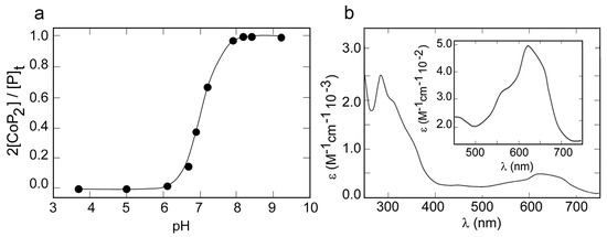 Cobalt was selected for initial binding studies, because Co(II) complexes show distinctive UV-visible spectra, which are sensitive to the metal coordination geometry and to the nature of the ligands [53]. To determine the optimal pH conditions for coordination, a UV-vis pH titration of METP3 in the presence of Co(II) ions was performed in the pH range 3.8–9.2 (Figure 2a). An increase in the absorption band intensities was observed upon raising the pH from 6 to 8.2. This indicates ligands deprotonation and concomitant coordination, with a midpoint transition at pH 7.1. Based on these results, all the spectroscopic studies were performed at pH 8.2.