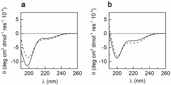 Far-UV CD spectra at 0.2 mM peptide concentration of fully reduced METP3 (solid lines) and Zn(II)-METP3 complex (dashed lines) in: (a) H2O at pH 7.5 or (b) TFE.
