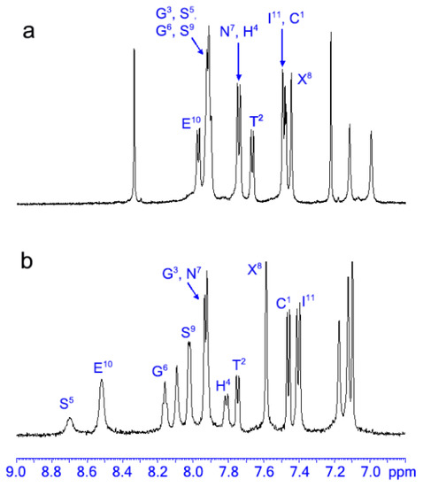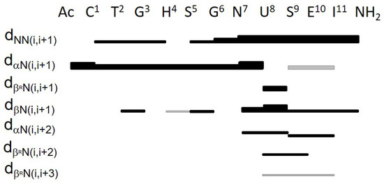 In the N-terminal region, the presence of NHi-NHi+1 connectivities suggests an α-turn conformation in the Cys1-Ser5 segment. An extended conformation can be inferred in the Gly6-Asn7 segment, because the 3JNH-αCH coupling constant values were found as 8.2 and 7.7 Hz for Gly6 and Asn7, respectively, and the ϕ solution of the Karplus equation [64] was −180° for both residues.