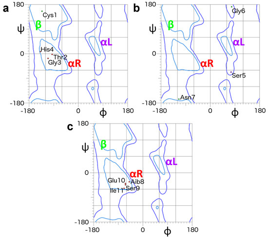 Ramachandran plots of the refined METP3 model. (a) Region from Cys1 to His4 encompassing a type IαRS turn. (b) Ser5 to Asn7 in the extended region. (c) Terminal helical region from Aib8 to Ile11. Color-coded labels define the most representative areas of the Ramachandran plot: right-handed α-helix/red, ß-strand/green, left-handed α-helix/violet. ϕ, ψ values of chain A are reported. Molprobity [71] has been used to generate the plot (http://molprobity.biochem.duke.edu/, accessed on 24 August 2021).