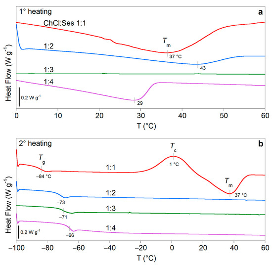 To obtain information about the thermal properties and molecular interactions of the four mixtures, they were characterized by DSC and IR spectroscopy. Figure 2 shows the DSC traces of the four mixtures acquired soon after thermal treatment at 4 °C for 24 h (first heating, Figure 2a) and after in-situ cooling at 10 °C/min (second heating, Figure 2b). During the first heating, the 1:1, 1:2, and 1:4 ChCl:Ses mixtures showed endothermic peaks at Tm = 37, 43, and 29 °C, indicating the melting temperatures of the crystals formed during storage at 4 °C. As expected, the 1:3 trace did not show any thermal transition. During the cooling, all mixtures remained in the amorphous state by undergoing a liquid–glass transition (data not shown). In the second heating, glassy mixtures evolved toward the liquid state at the glass transition temperature, which was observed as a step in the heat flow at Tg = −84, −73, −71, and −66 °C for the 1:1, 1:2, 1:3, and 1:4 ChCl:Ses mixtures, respectively. Moreover, the 1:1 composition also exhibited a recrystallization at Tc = 1 °C, followed by the melting at the same temperature of the previous heating step (Tm = 37 °C).