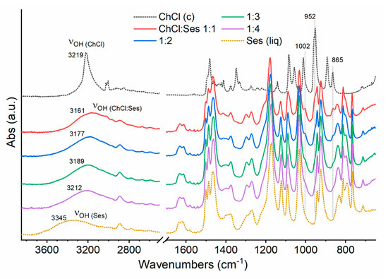 ATR-FTIR spectra of crystalline ChCl (black dotted line), liquid Ses (yellow dotted line), and ChCl:Ses eutectic mixtures (solid lines) with ChCl:Ses 1:1, 1:2, 1:3, and 1:4, acquired at room temperature.