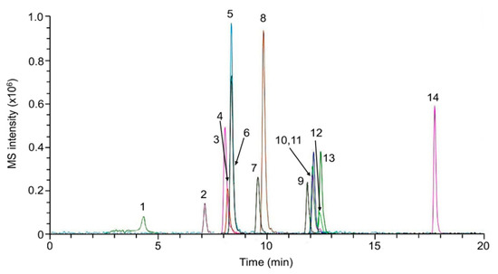 HPLC-MRM of a working standard solution (5 ng injected). Number of peak identification: 1. BUF, 2. COD, 3. MDMA, 4. MDPPP, 5. PMA, 6. EPH, 7. bk-MMBDB, 8. MBDB, 9. HER, 10. MPBP, 11. α-PVP, 12. KET, 13. MDPV, 14. NAPH.