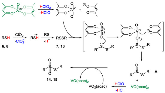 VO(acac)2 is probably oxidized with HClO2 to the compound VO2(acac) by oxo-transfer mechanism [17]. Then, the disulfide molecules are coordinated on the oxygen atom of VO2(acac), oxidized to thiolsulfinates A, and the VO2(acac) compound is reduced to VO(acac)2. The next stage is the catalytic oxidation of thiosulfinates A to thiosulfonates 14 and 15.