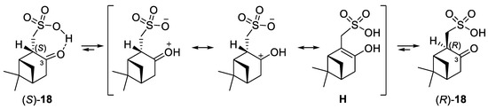 The acidic nature of the epimerization of acid (2S)-18 is confirmed by a similar reaction in an aqueous solution of pyridine. Under these conditions, acid (2S)-18 is quantitatively formed (de 98%). Pyridine, being basic in nature, binds the mobile proton of the SO3H-group and prevents the enolization process.
