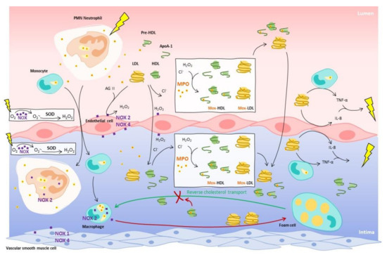Activation of endothelium by LDLs promotes migration of monocytes and lymphocytes (neutrophils) into the underlying intima, and monocytes are then differentiated in macrophages. MPO can be found in neutrophils and macrophages. With the presence of Nox on endothelial cells, neutrophils and macrophages, H2O2 is produced by consuming the burst of oxygen from the inflammation. MPO interacts with LDLs and HDLs in both lumen and intima to oxidize apolipoproteins using chloride ions and H2O2 and produces Mox-LDLs and Mox-HDLs. While HDLs promote reverse cholesterol transport (RCT), Mox-HDLs are unable to perform the RCT and promote formation of foam cells, such as Mox-LDLs. Furthermore, Mox-LDLs induce pro-inflammatory activity from endothelial cells by stimulating the production of IL-8, and from monocytes by generation of TNF-α. MPO modifications contribute to maintain the inflammation in the vascular wall and in the vascular lumen.