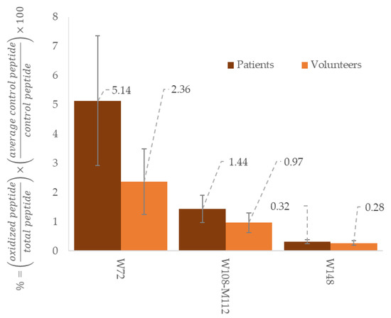 Quantitation and confirmation of these peptides are ensured using two optimized multiple-reaction-monitoring (MRM) transitions (Table 3). The specific pair of mass-to-charge ratio (m/z) values associated with the precursor and product ions selected cannot be mistaken with another compound from the samples, to avoid interferences. The most abundant product ion is used as the quantifier for quantitation of the corresponding peptide. The second most abundant and a specific one is used as a qualifier to confirm the identification of the peptide. The quantitation of apolipoproteins require analysis of a control peptides, which do not carry amino acid subject to MPO-modifications and therefore only depend on quantity of the protein. Qualitative assessment is ensured using potentially in vivo MPO-modified peptides. MPO activity on apoA-1 and apoB-100 is evaluated by a ratio between peptides carrying MPO modifications and the corresponding peptides without alteration (Figure 2). A peptide is identified to be MPO-modified when its m/z ratio is superior to the m/z of its native form. The difference corresponds to the addition of oxygen during the oxidation. In addition, oxidized peptides are eluted from the column earlier than their unmodified form. For example, in Table 3, W72 Ox appears at 10.3 min, while its native form W72 is detected at 10.7 min. This retention time shift can also help to distinguish a difference between in vivo and artificial oxidation from sample preparation or analysis. Therefore, three kinds of peptides are examined to assess concomitantly quantity and quality of apoA-1 and B-100: control peptides, native peptides and oxidized peptides.