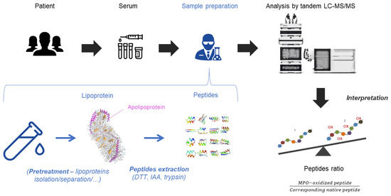 From serum to peptides analysis. Serum samples content lipoproteins with apolipoproteins on their surface. If needed, a pre-treatment to isolate/separate lipoproteins can be used. In order to extract peptides from apolipoproteins, a proteomic sample treatment is applied with dithiothreitol (DTT), iodoacetamide (IAA) and trypsin. The mix of peptides is analyzed by the tandem LC-MS/MS. The results are expressed in peptides ratio between the MPO-oxidized peptides and their corresponding native peptides.