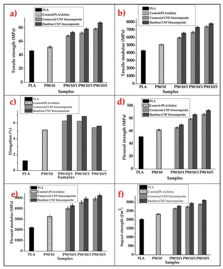 2.3. The Mechanical Properties of Bamboo and Commercial CNF-Reinforced PLA/Chitin Bionanocomposites