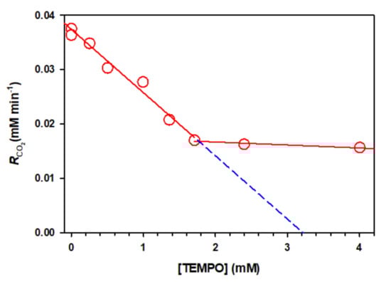 Rates of CO2(g) evolution () vs. the initial concentration of TEMPO for the 313 nm photolysis of fully deaerated 100 mM PA aqueous solutions at 293 K [5]. Copyright 2006, American Chemical Society.