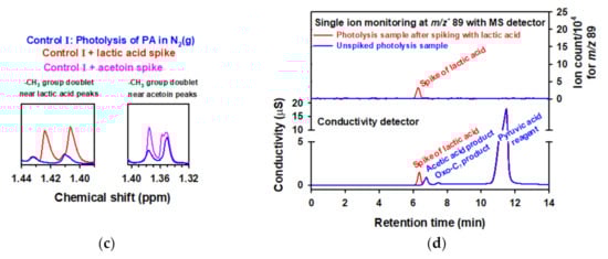 (a) Infrared spectrum of (blue line) gas products collected over 50 mM aqueous PA after photolysis (λ > 305 nm) for 1 h, (gray line) acetoin standard, and (red line) gas product spiked with acetoin clearly demonstrating the absence of this molecule in the headspace of the reactor [83]; (b) extracted ion (m/z− = 267) chromatogram obtained by ultrahigh-pressure liquid chromatography/electrospray ionization(−)/MS (blue line) before and (red) after spiking the photolyzed PA sample for a final concentration of 20 μM acetoin prior to derivatization to form hydrazones. Retention times for the two hydrazones of PA are 4.60 and 6.40 min, and for the hydrazone of acetoin is 5.80 min (only observable in the spiked sample) but absent in the unspiked chromatogram [83]. (c) To the left hand-side is the 1H NMR spectrum for (blue), the −CH3 group doublet centered at ∼1.42 ppm in a control with 100.1 mM PA at pH 1.0 photolyzed at λ ≥ 305 nm for a 50% reagent conversion under continuous sparging with N2(g), and (red) the mismatch for this doublet after spiking to final concentration of lactic acid of 9.34 mM. To the right hand-side is the 1H NMR spectrum for (blue), the −CH3 group doublet centered at ∼1.36 ppm in the same control in left hand-side, and (pink) the mismatch for this doublet after spiking to an acetoin final concentration of 10.02 mM. This quality assurance analysis clearly demonstrated that lactic acid and acetoin are not photoproducts when working with well purified PA [77]. (d) At the bottom, the ion chromatogram is shown with conductivity detection for the region of elution of lactic acid for a control with 99.22 mM pyruvic acid at pH 1.0 photolyzed at λ ≥ 305 nm for a 21% reagent conversion under continuous sparging with N2(g) (blue) before and (red) after spiking to a final lactic acid concentration of 14.9 μM. The anions of all species were assigned with available standards and/or using the m/z− values obtained by tandem mass spectrometry. At the top, the extracted ion chromatogram for lactic acid is shown (m/z− 89) (blue) before and (red) after spike addition of lactic acid for the same samples in the bottom part of this panel, which completely discard the photoproduction of lactic acid when working with well purified PA [77]. Panels a and b: Copyright 2013, Proceedings of the National Academy of Sciences of the United States of America. Panels c and d: Copyright 2017, American Chemical Society.
