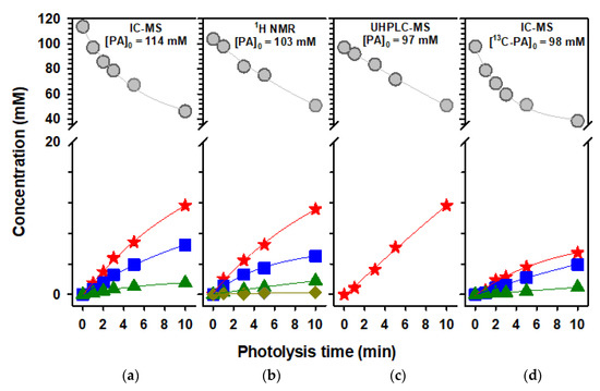 Quantitative time series for the aqueous photolysis at λ ≥ 305 nm of (gray circle) PA with the formation of (red star) the oxo-C7 product, (blue square) DMTA, (green triangle) the oxo-C8 product, and (gold diamond) acetic acid. The analytical method and initial concentration of PA are summarized at the top of each panel. (a) Ion chromatography (IC) with conductivity and mass spectrometry detection of anions. (b) Quantitative 1H-NMR. (c) UHPLC-MS from DNPH hydrazones of PA and the oxo-C7 product. (d) IC conductivity MS when using fully labeled 13C-PA. Copyright 2017, American Chemical Society [2].