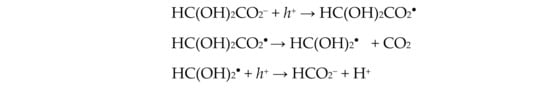 In the 400 nm irradiation of gas phase GA adsorbed on TiO2, GA was photocatalytically converted to CO2, carbonate and formate [55]. Hydrated glyoxylate underwent a one electron loss to be oxidized forming an acyloxyl radical (HC(OH)2CO2•), which then decarboxylated to give CO2 and HC(OH)2•, which underwent an additional one electron loss oxidation coupled with deprotonation to make formate as shown below in Scheme 3: